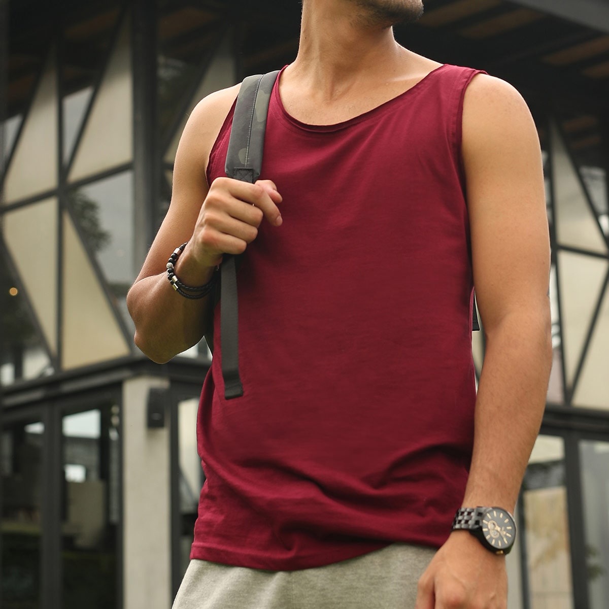 Rediscover your aura in casual tank top with vintage style self fabric collar and sleeve, finished white chest print on left side.